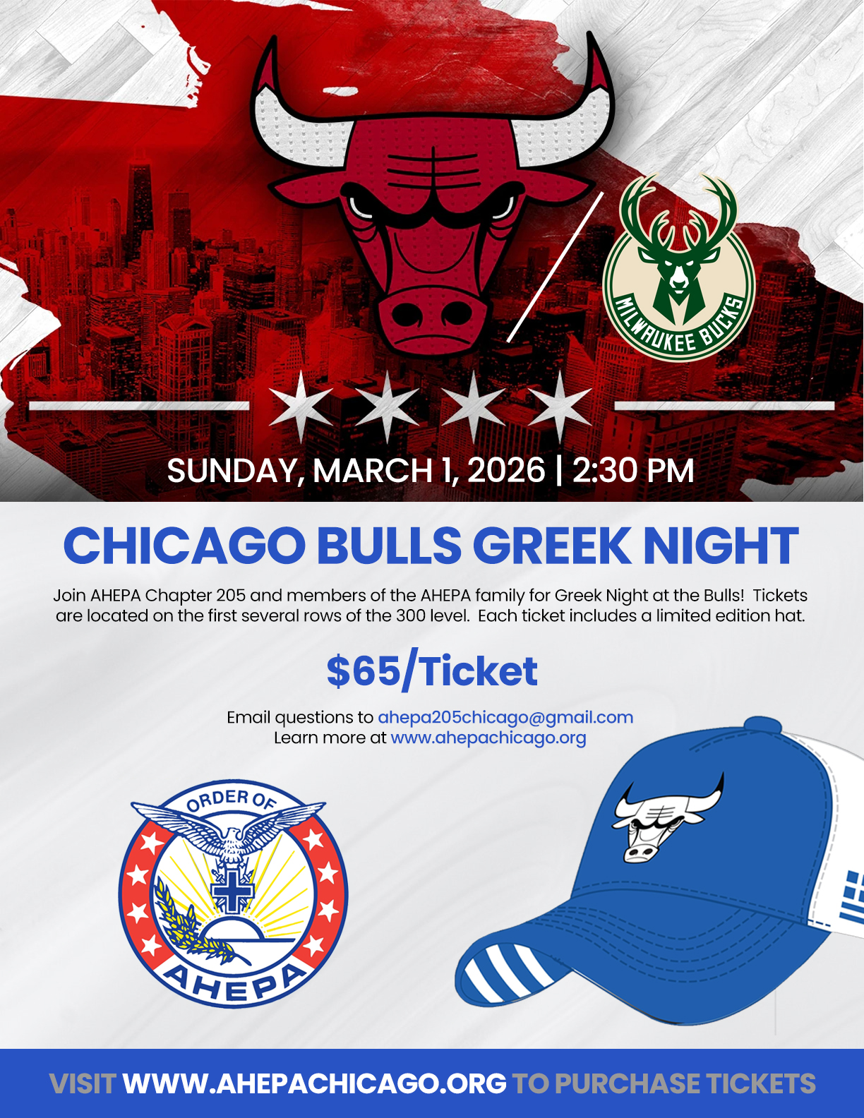 Join AHEPA on Sunday, March 1, for Greek Night at the Bulls! The Chicago Bulls will be taking on Giannis Antetokounmpo and the Milwaukee Bucks. Tickets are $65/person and include a limited edition Greek Themed Bulls hat. Game begins at 2:30PM.