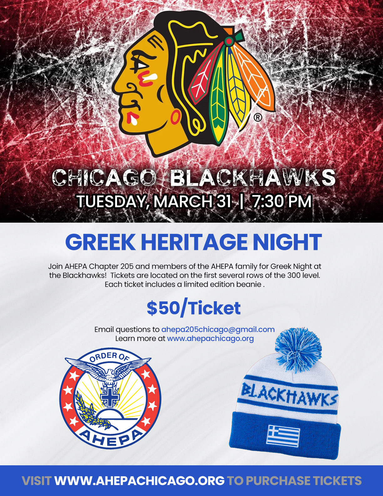 Join AHEPA on Tuesday, March 31, for Greek Night at the Blackhawks! The Chicago Blackhawks will be playing the Winnipeg Jets. Tickets are $50/person and include a limited edition Greek Themed beanie hat. The game begins at 7:30PM.