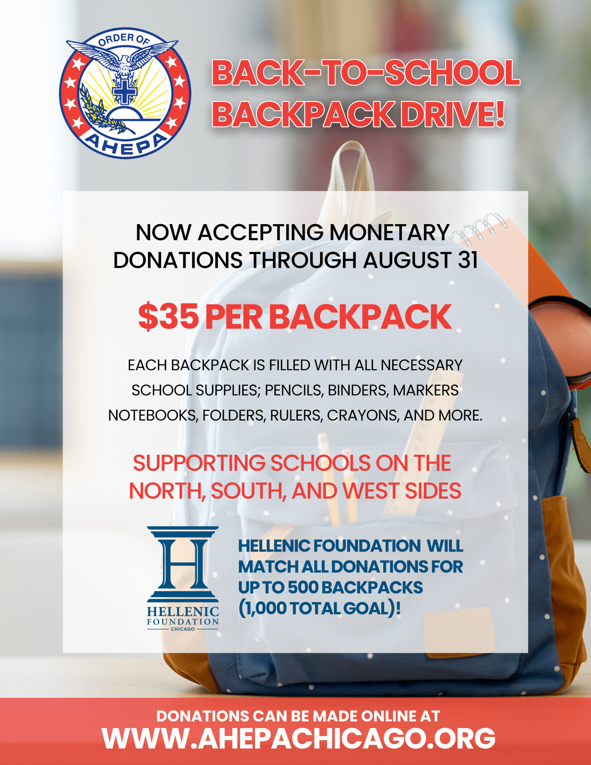 AHEPA Chicago Lakeshore Chapter 205 is once again teaming up with Focus to deliver backpacks full of school supplies to children throughout the Chicagoland area. Each child will receive a backpack that is filled with all the necessary school supplies; pencils, binders, markers, notebooks, folders, rulers, crayons, erasers, glue, and more!